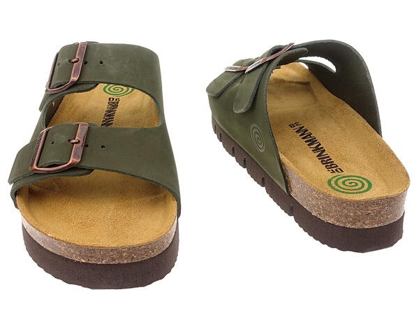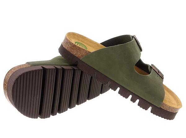Klapki wykonano z bardzo wysokiej jakości skóry naturalnej, nubukowej w oliwkowym odcieniu zieleni miękkiej i przyjemnej w dotyku, która idealnie układa się do stopy.
