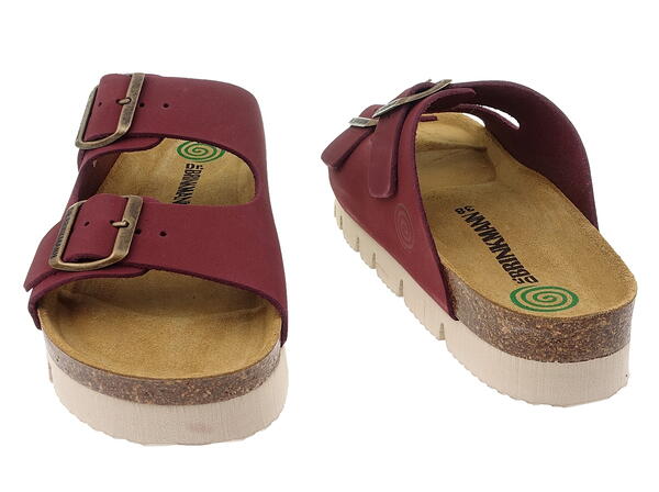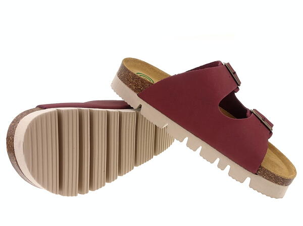 Klapki wykonano z bardzo wysokiej jakości skóry naturalnej, nubukowej w najnowszym bordowym kolorze miękkiej i przyjemnej w dotyku, która idealnie układa się do stopy.