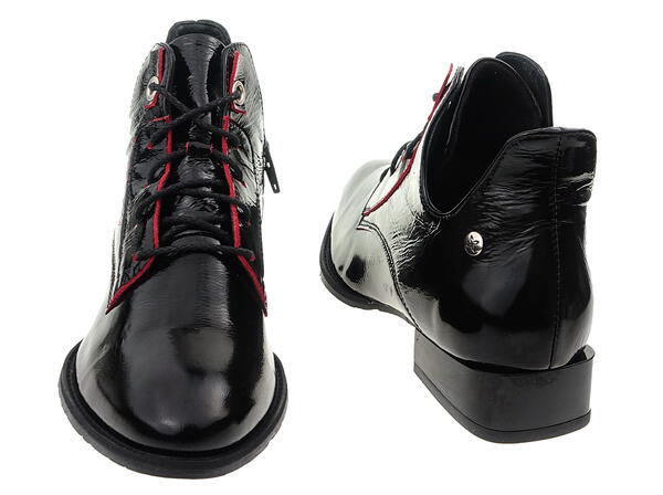 Cholewki z miękkiej, lakierowanej skóry naturalnej w czarnym kolorze z czerwonymi dodatkami, wyglądają bardzo kobieco i pasują do wielu różnorodnych stylizacji.