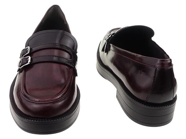 Obuwie z serii Vegan zostało wykonane z ekologicznej skóry lakierowanej bardzo miękkiej i przyjemnej w dotyku w przycieranym, bordowym kolorze z ozdobnymi sprzączkami na cholewkach.