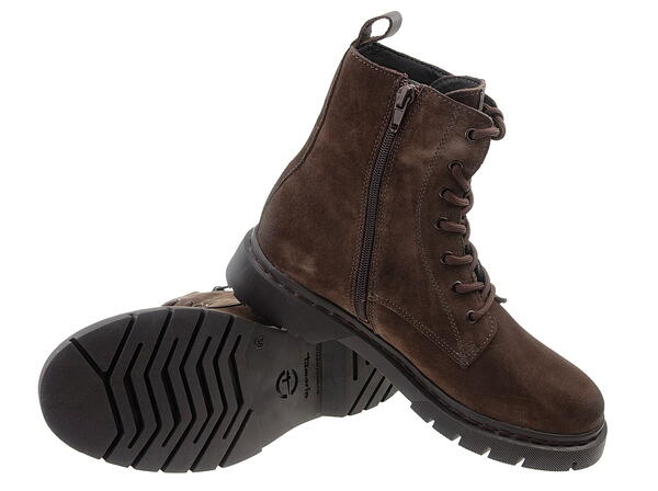 Klasyczne i komfortowe trzewiki damskie w stylu militarnym, niemieckiej marki Tamaris cechuje stosunkowo lekka konstrukcja i przyjemna skóra naturalna, welurowa.