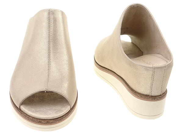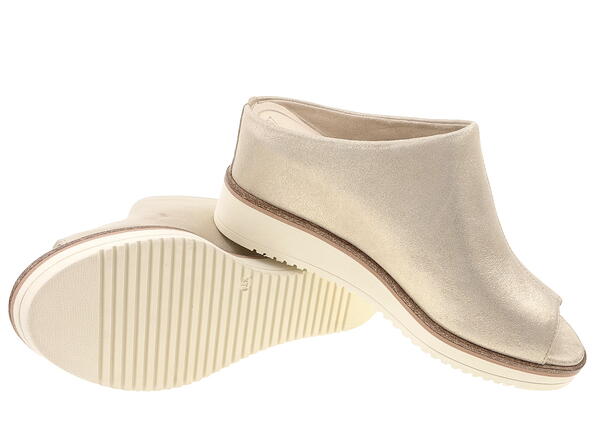 Klapki wykonano z naturalnej skóry welurowej w delikatnie połyskującej złotej kolorystyce bardzo miękkiej, elastycznej i przyjemnej w dotyku. W tym modelu zastosowano specjalny system super miękkich wkładek TOUCH IT, które świetnie dopasowują się do kształtu stopy.