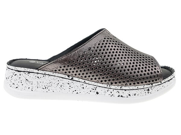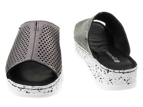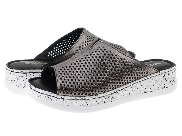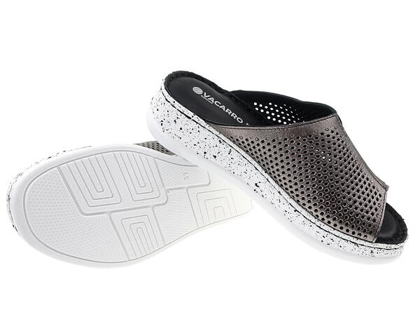 Najnowsze, oryginalne, lekkie klapki damskie, skórzane znanej marki Vacarro 1717 w kolorze ciemnosrebrnym.