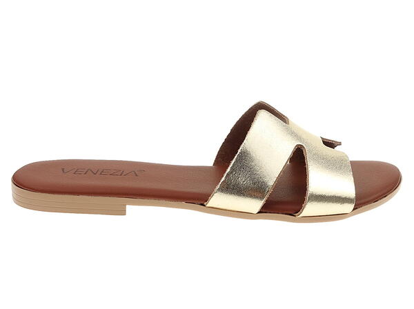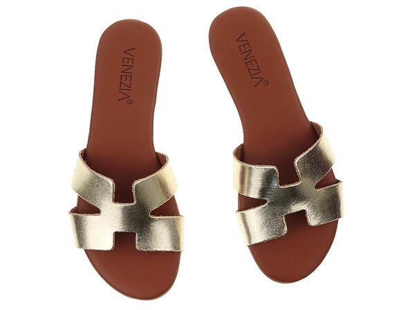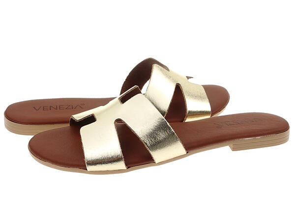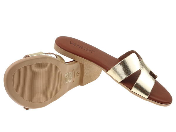 Skórzane, oryginalne, najnowsze klapki damskie ekskluzywnej marki Venezia I014LEGOOBK056 w kolorze złotym.