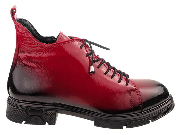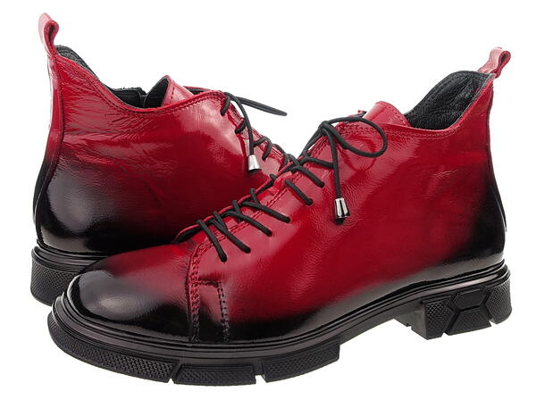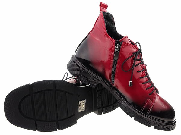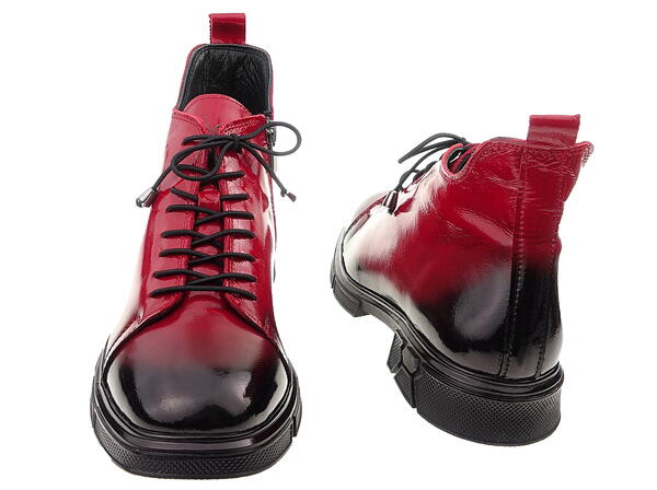 Cholewki z miękkiej, lakierowanej skóry naturalnej w cieniowanej czerwieni, wyglądają bardzo kobieco i pasują do wielu różnorodnych stylizacji.
